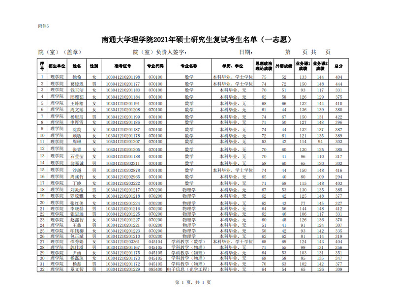 南通大学理2048核基地 2021年硕士研究生复试考生名单(一志愿)