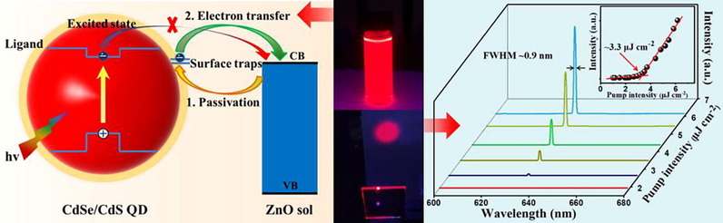 该研究面向传统胶体半导体量子点表面有机配体的局限性问题,利用无机氧化锌溶胶来实现量子点表面缺陷态钝化、提高其光学性能稳定性。同时,CdSe/CdS@ZnO量子点展现出抑制的俄歇过程和荧光闪烁现象,在量子点薄膜中观察到了稳定的放大自发辐射过程。基于该量子点的垂直腔面发射微腔激光器实现了低阈值的空间定向单模激光发射。因此,无机溶胶配体概念的提出对于提升胶体半导体纳米材料的光学性能、进一步构建全无机光电子器件具有重要意义。