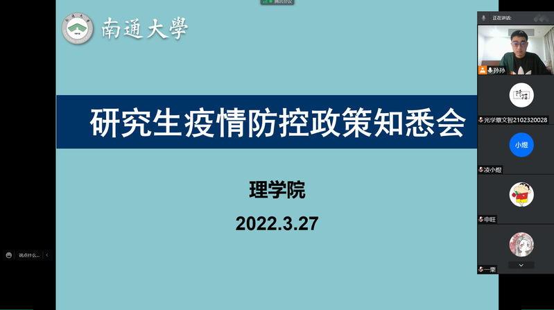 研究生辅导员孙宜澎向同学们传达了南通大学疫情防控工作的相关政策,在学校疫情防控形势、校园主要风险点及防控措施等方面做出详细解释,强调大家要坚持每日健康打卡制度,按时参加核酸检测,严守学校疫情防控底线,禁触学校疫情防控红线。