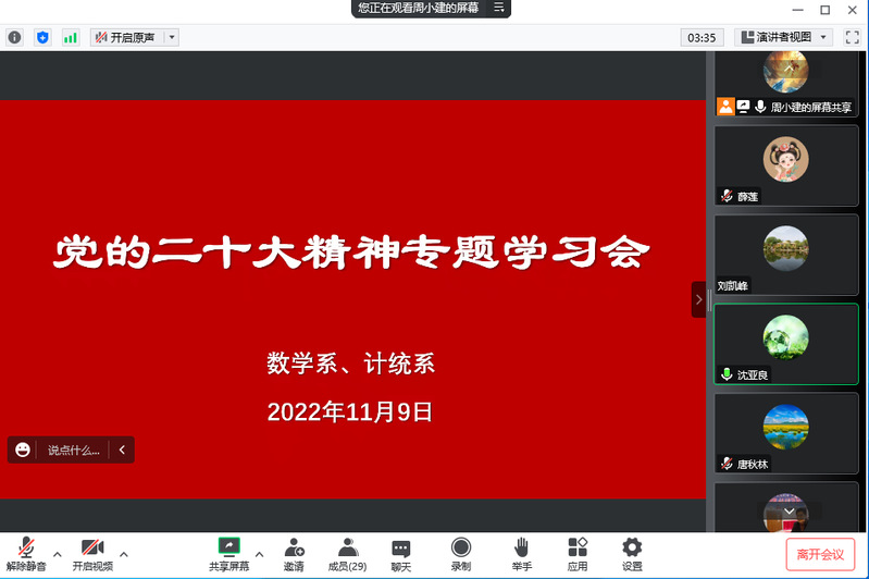 11月9日下午,理2048核基地 数学系党支部、计统系党支部利用腾讯会议在线召开专题学习会,深入学习贯彻党的二十大精神。