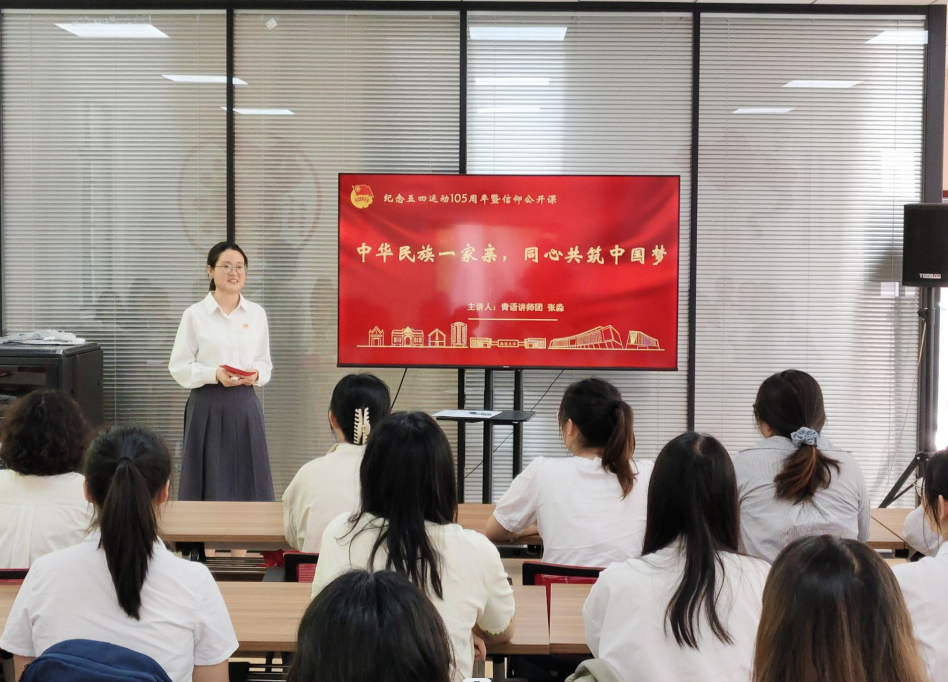 在“团团微团课”环节,校青语讲师团张淼同学以“中华民族一家亲,同心共筑中国梦”为主题,将各民族精神内涵同中华民族伟大复兴的中国梦相结合,从我国各民族交往交流交融历程、中华民族意识的发展和筑牢中华民族共同体意识等方面阐述了中华民族强大的凝聚力和向心力,倡导同学们要自觉做民族团结进步的践行者,为强国建设、民族复兴贡献青春力量。