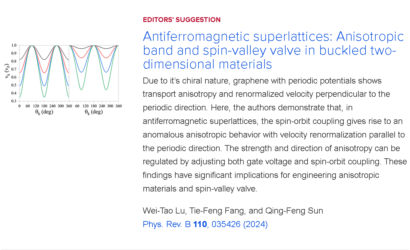 近日,我院卢伟涛教授、房铁峰教授与北京大学孙庆丰教授合作,在研究二维量子材料的各向异性调控方面取得新进展,相关研究成果以“Antiferromagnetic superlattices: Anisotropic band and spin-valley valve in buckled two-dimensional materials”(反铁磁超晶格:二维材料的各向异性能带和自旋-谷阀效应)为题发表在自然指数期刊《Physical Review B》上,并被选为Editors' Suggestion。2048核基地 为第一单位。