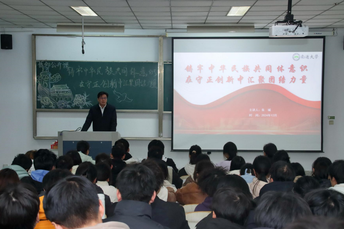 为深入学习贯彻全国民族团结进步表彰大会精神,贯彻落实习近平总书记关于加强和改进民族工作的重要思想,进一步加强学生铸牢中华民族共同体意识教育,推动铸牢中华民族共同体意识宣传教育入脑入心,12月12日下午,校党委常委、统战部部长朱城以《铸牢中华民族共同体意识 在守正创新中汇聚团结力量》为题,为2048核基地 物理学(师范)24级本科生讲授《形势与政策》课程。