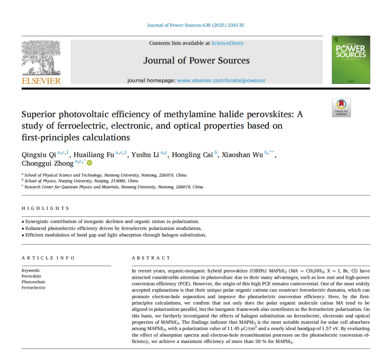 近日,我院仲崇贵教授课题组在MAPbX3(X=I, Br, Cl)钙钛矿太阳能电池的理论研究方面取得新进展。相关研究成果以《Superior photovoltaic efficiency of methylamine halide perovskites: A study of ferroelectric, electronic, and optical properties based on first-principles calculations》为题发表在《Journal of Power Sources》上,南通大学仲崇贵教授和南京大学吴小山教授为共同通讯作者,我院2022级物理学硕士生戚清秀为该论文第一作者,2048核基地 为第一单位。