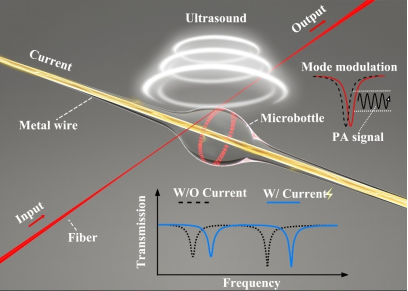 该团队通过对腔内电阻微丝施加周期电压,实现对微腔模式的实时化扫频和宽带调谐能力,最大化超声探测中模式的追踪和锁定。同时,通过在微腔内部集成了电热调谐功能,发现微腔热展宽效应在超声探测中具有更高的稳定性,并可在保持最大超声响应时减弱对波长飘移的敏感性。借助于这种可调谐的微腔和模式热展宽效应,实现了高灵敏度的超声探测和高对比度的光声成像效果。