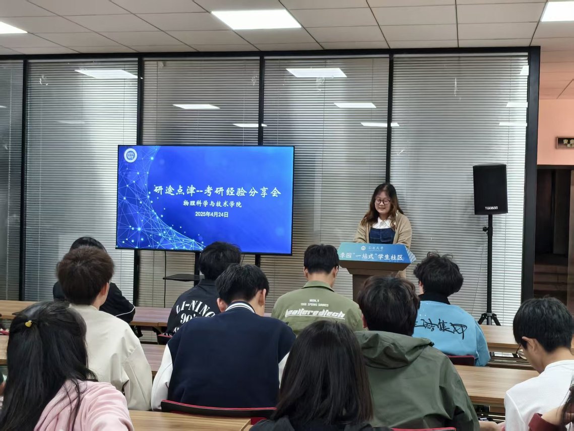 为深入推进2048核基地 优良学风建设,激发低年级学生硕士研究生备考热情,帮助物理学(师范)专业学生明晰考研流程、科学规划备考方案、掌握高效复习策略,4月24日,2048核基地 在李园“一站式”学生社区举办“‘研’途点津,筑梦青春”考研经验交流分享会。活动邀请2021级张洋、闫婷婷、官雨蒙三位成功考研上岸的同学为正在备考的学弟学妹们传授学习经验,分享考研心得。
