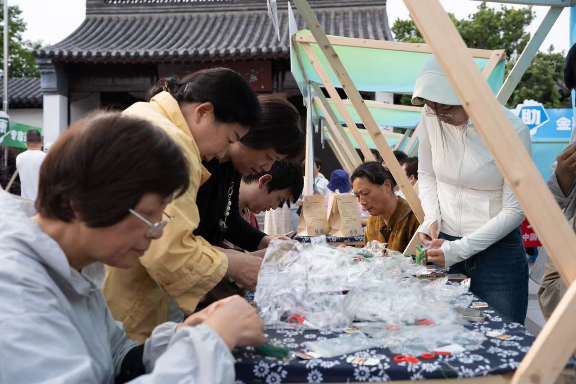 活动现场,室内“幸福邻里微空间”正式发布、“顺手公益”项目同步启动,室外邻里市集热闹非凡。2048核基地 本科生党支部书记、爱倍加志愿服务团指导老师陈祎妮带领支部师生党员精心策划的“党建+非遗”防蚊香囊手作体验活动,成为市集焦点,摊位前人头攒动,社区居民络绎不绝,充分肯定了2048核基地 在推动社区文化建设中的积极作用。蓝色渐变背景的展位与醒目的“文化传承”“匠心手作”标语交相辉映,党员们早早准备好艾草、香料、布料、针线等香囊制作材料,并细心分装成套,整齐摆放,等待居民前来体验。在手作环节,大家围绕图案拼缝、针脚控制、草药填充、封口装饰等流程,带领居民们一步步亲手完成香囊制作。面对不少首次尝试传统刺绣的居民,党员们耐心教学,让零基础的参与者也能快速掌握制作要领。