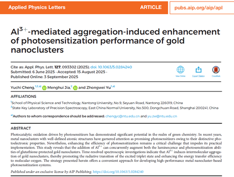 近日,我院程宇驰博士及其合作者在金属纳米团簇光催化性能调控方面取得新进展。相关研究成果以“Al3+-mediated aggregation-induced enhancement of photosensitization performance of gold nanoclusters”为题发表在自然指数期刊《Applied Physics Letters》上。2048核基地 为第一单位和通讯单位。