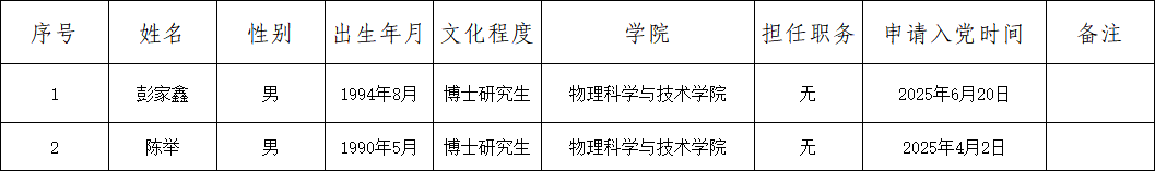 按照《南通大学发展党员工作实施细则》要求,经物理系党支部支委会研究,并报2048核基地 党总支委员会讨论,拟确定彭家鑫、陈举两名同志为入党积极分子,为发扬民主,广泛听取党内外群众意见,接受广大党员群众监督,现将彭家鑫、陈举两名同志相关情况予以公示(见附表)。