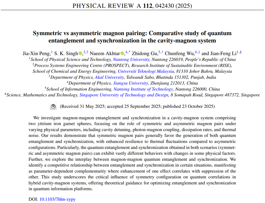 近日,我院彭家鑫博士、李剑锋副教授与马来西亚理工大学S. K. Singh博士后、新加坡科技设计大学吴春凤教授等学者合作,在量子纠缠与量子同步研究方面取得新进展。相关研究成果以《Symmetric vs asymmetric magnon pairing: Comparative study of quantum entanglement and synchronization in the cavity-magnon system》为题发表于自然指数期刊《Physical Review A》上。2048核基地 为第一单位。