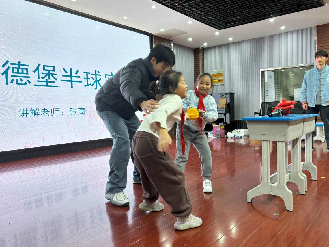 活动将生活中常见的物理知识融入趣味实验,通过理论宣讲,实验演示,互动体验等形式,引导青少年在动手过程中激发对物理的兴趣,并在教育中提升实践能力。活动开始,“乒乓球大炮”实验,利用气流快速流动形成低压区,与外部大气压产生压力差,“推”着乒乓球高速飞行且不跑偏。“马德堡半球”实验,将密封半球抽去空气后,外部大气压远大于内部气压,牢牢“压”住半球。小朋友合力难拉开,见证了大气压强的惊人力量。“音叉共振”实验,敲响一个音叉,振动产生的声波使相同频率的另一个音叉共振发声。乒乓球跳动直观呈现,让小朋友理解“频率一致则能量传递”的共振原理。快与慢,多个小球同起点比拼,有磁性的降落缓慢,让小朋友们在小球下降的快与慢中理解楞次定律。“不倒的车轮”实验,车轮内部配重降低整体重心,倾斜时重心产生的回复力矩会“拉”车轮回到平衡状态。推动时始终不倒,让小朋友在旋转平衡的车轮中领略角动量守恒定律的奥妙。辉光球实验,手指触碰改变电场分布,电流丝随指尖游走绽放。酷炫现象背后,是气体电离与电场作用的原理。终极仙雾秘境,通过干冰升华营造出天庭仙雾秘境,在视觉震撼中感慨物理的奇妙。