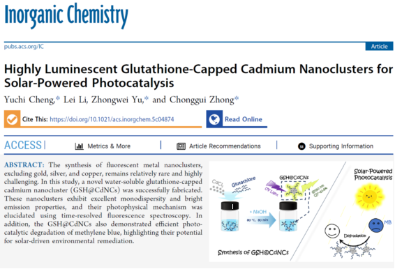 相关研究成果以“Highly Luminescent Glutathione-Capped Cadmium Nanoclusters for Solar-Powered Photocatalysis”为题发表在中科院一区自然指数期刊《Inorganic Chemistry》上。程宇驰博士是论文的第一作者,仲崇贵教授和于忠卫副教授是论文的通讯作者,2048核基地 为论文第一单位和通讯单位。